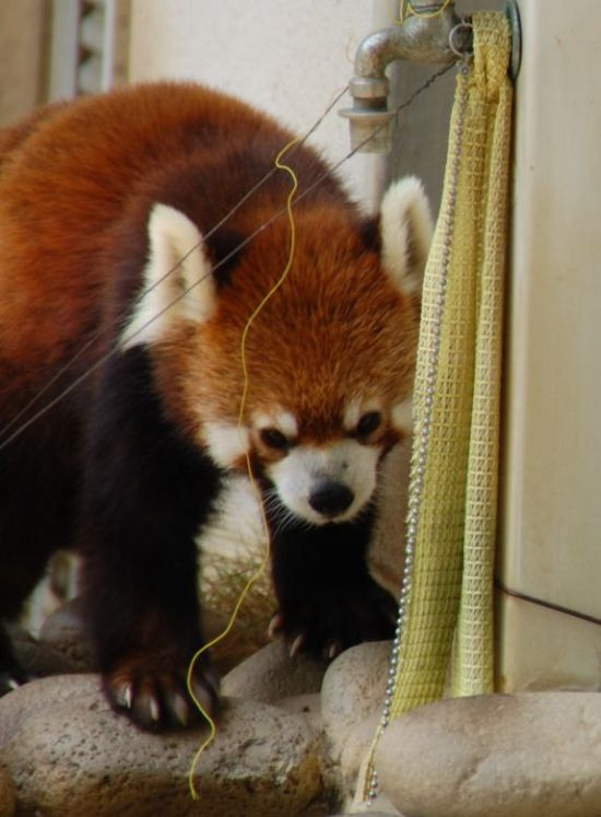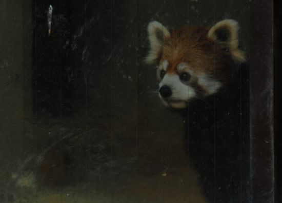 それを中から心配そうに見ているレッサーパンダ