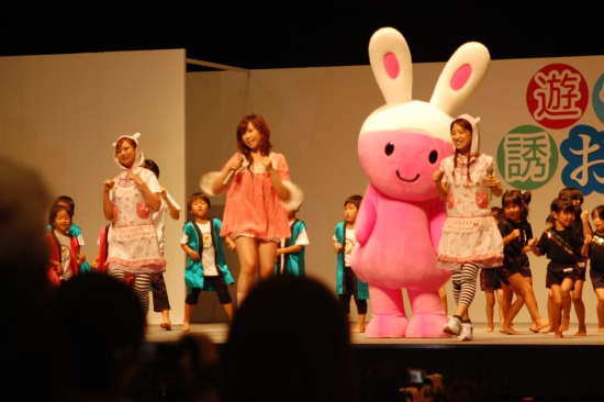 メインステージでの福井テレビのキャラクターイヤイヤちゃんイヤイヤちゃんがウサギの帽子をかぶった人間だと聞いて驚いた