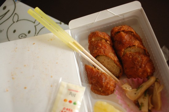 変わったお弁当「ソースかつ棒」薄いカツの中にご飯が詰まっている