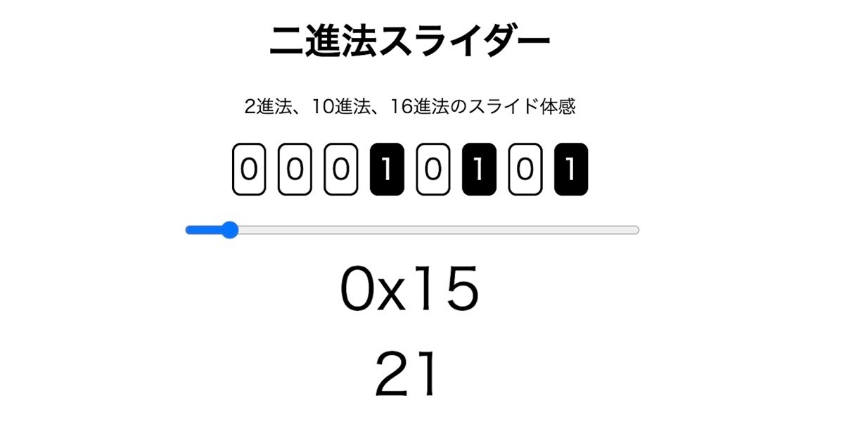 値域は0から255までの8bit。スライドしながらくるくる変わる0と1のbit(ビット)や、4bit毎に対応する16進法の秀逸さを体験ください!