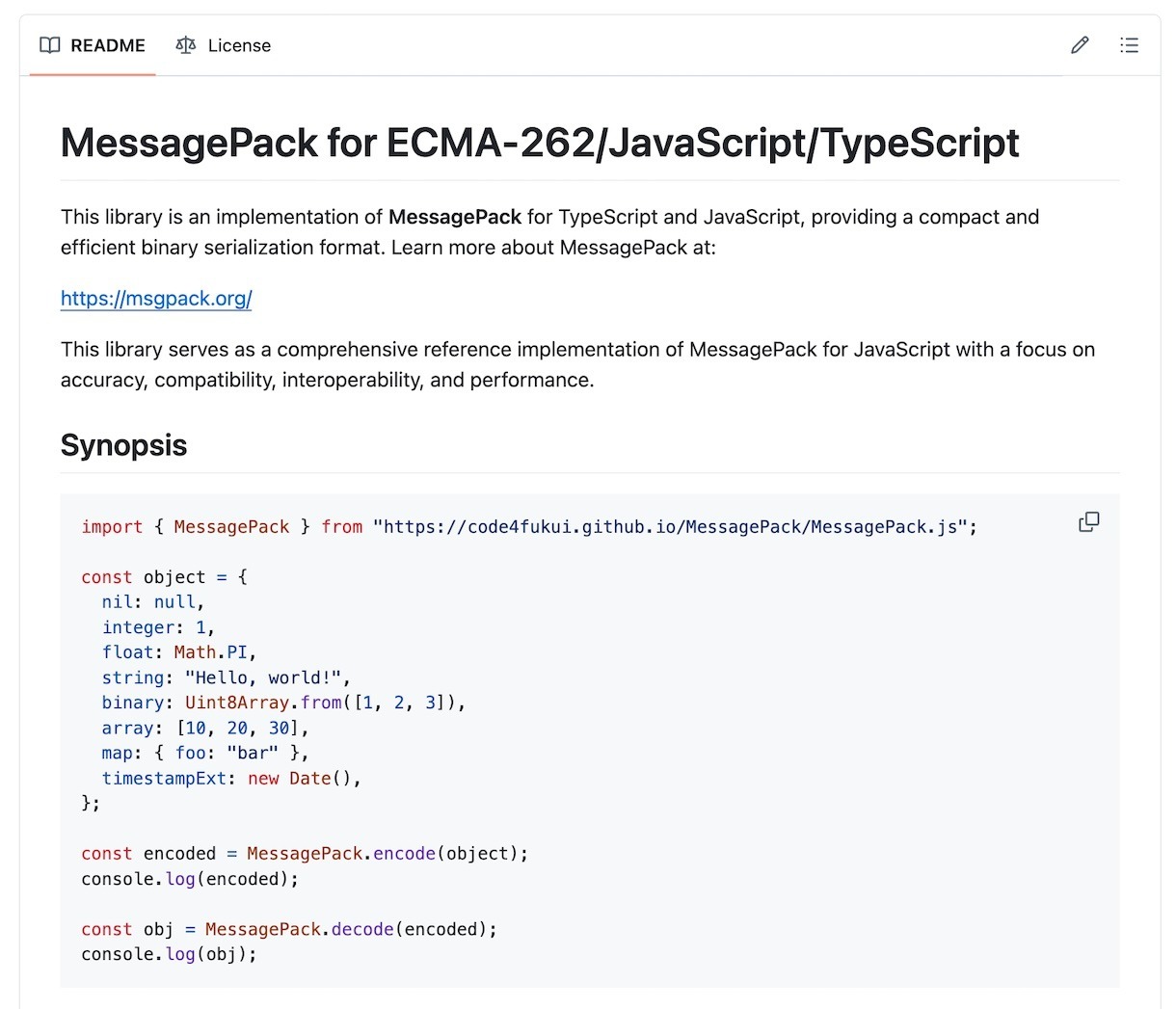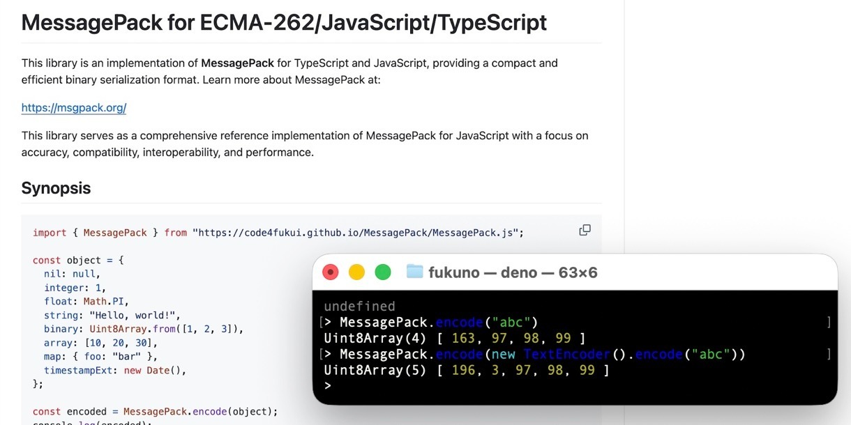「code4fukui/MessagePack: @msgpack/msgpack - MessagePack for JavaScript / msgpack.org[ECMA-262/JavaScript/TypeScript]」
