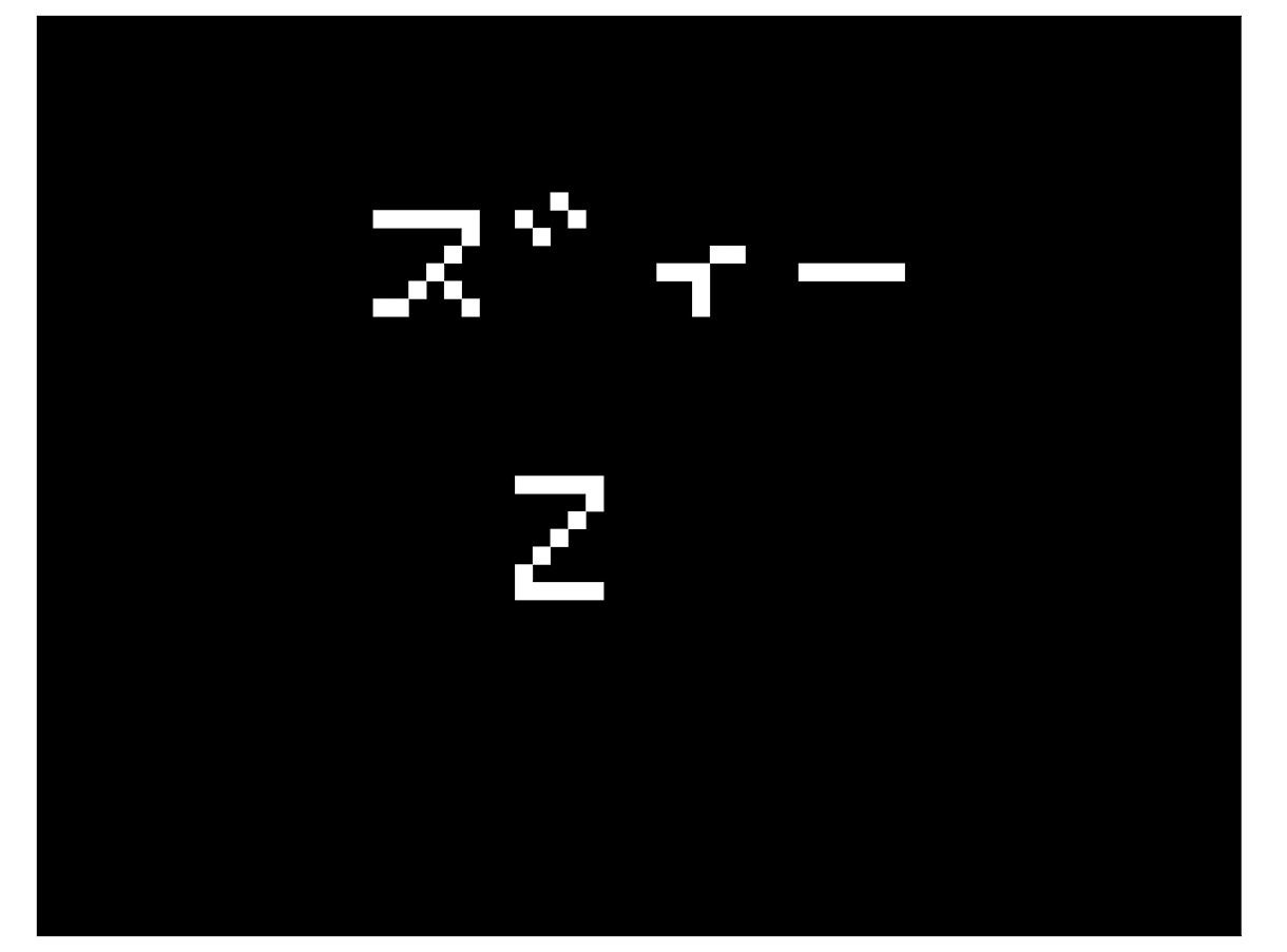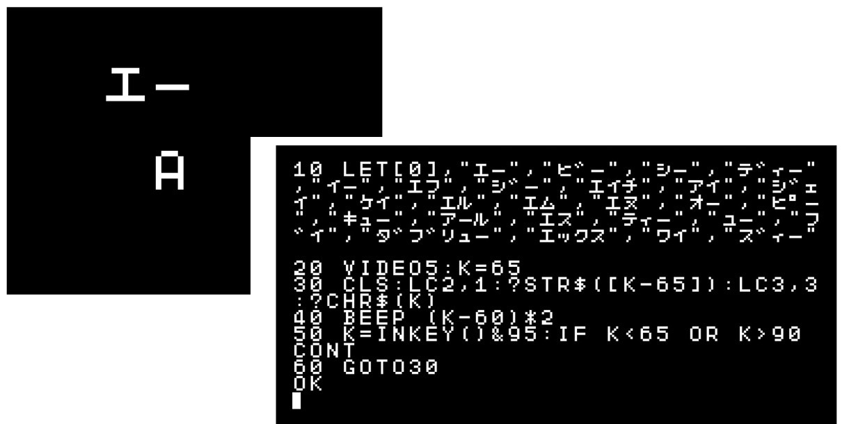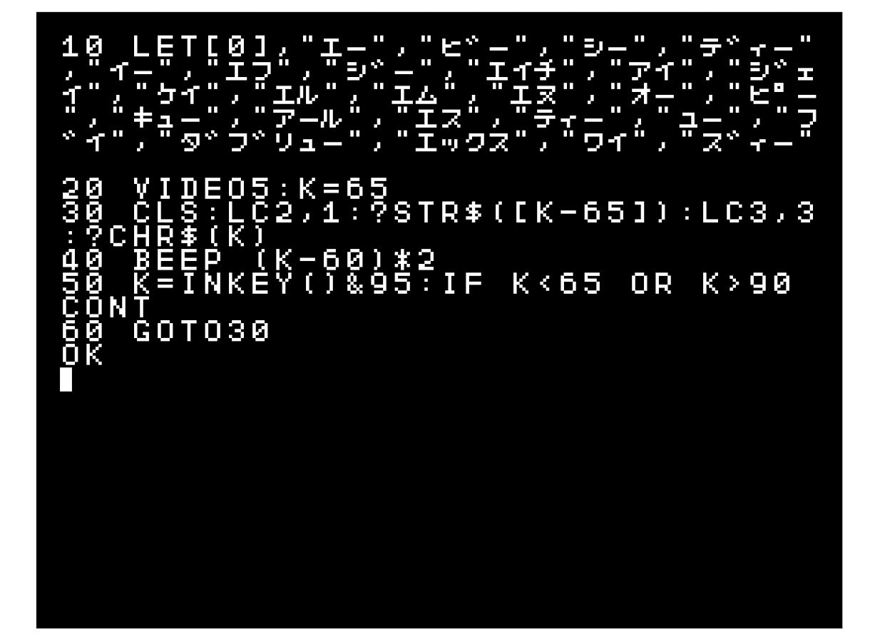 10 LET[0],"エー","ビー","シー","ディー","イー","エフ","ジー","エイチ","アイ","ジェイ","ケイ","エル","エム","エヌ","オー","ピー","キュー","アール","エス","ティー","ユー","ブイ","ダブリュー","エックス","ワイ","ズィー" 20 VIDEO5:K=65 30 CLS:LC2,1:?STR$([K-65]):LC3,3:?CHR$(K) 40 BEEP (K-60)*2 50 K=INKEY()&95:IF K<65 OR K>90 CONT 60 GOTO30