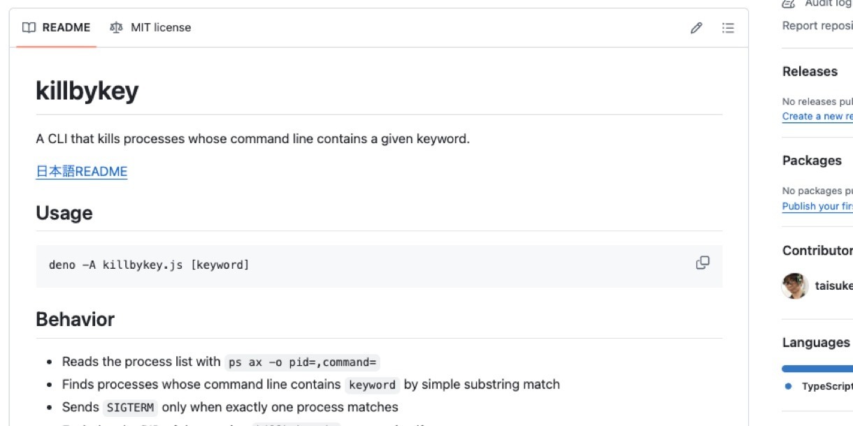 今回はOpenAIのcodexを使ったAI開発。README.ja.md で次のように書き