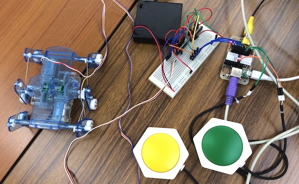 FourBeatのボタン入力を受けて、昆虫ロボットを前進や後退させるプログラム