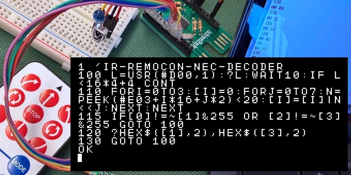 ソフトウェアは、以前作ったIchigoJamで作るIoT学習リモコンのコードに加えて、9msecのON、4.5mescのOFFに続く32bitでカスタマーコードコードとデータが反転チェック付きで送信される、NECフォーマットデコーダーをIchigoJam BASICで実装。