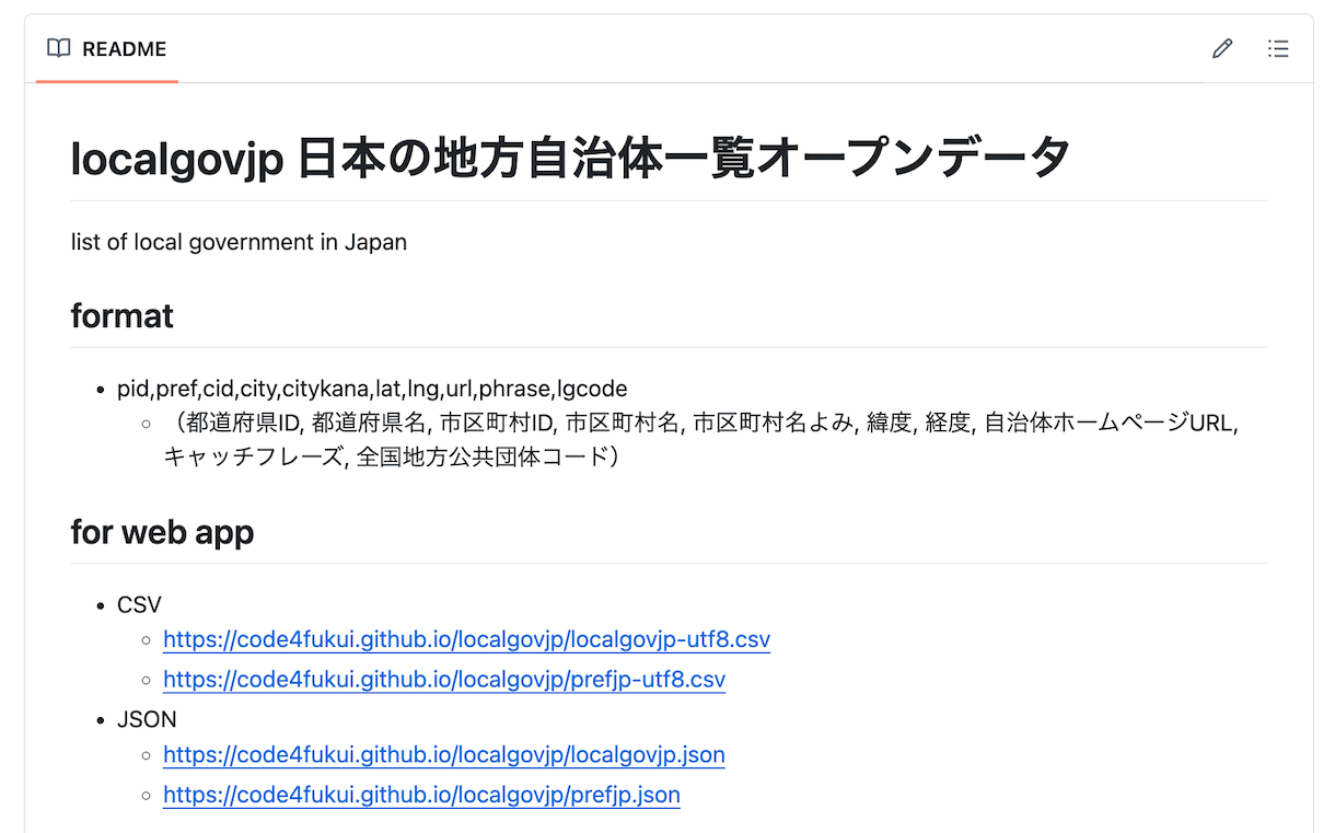 「code4fukui/localgovjp: list of local government in Japan (日本の地方自治体一覧オープンデータ) JSON/CSV」