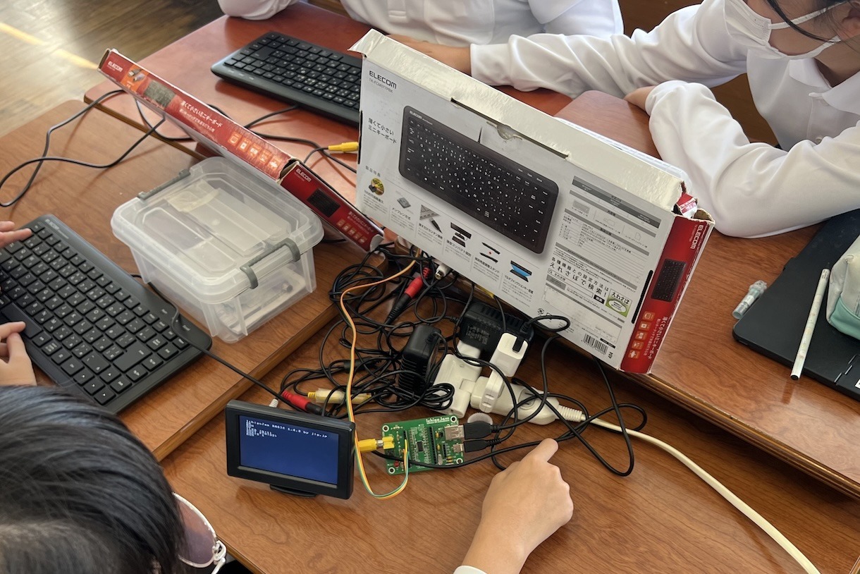 鯖江市中河小学校にて、プログラミングの授業、サイバーセキュリティ。本体のボタンを使うとうっかりリセットなどが発生するので、スペースキーとLEDで伝えるバージョンも使って、通信実験!