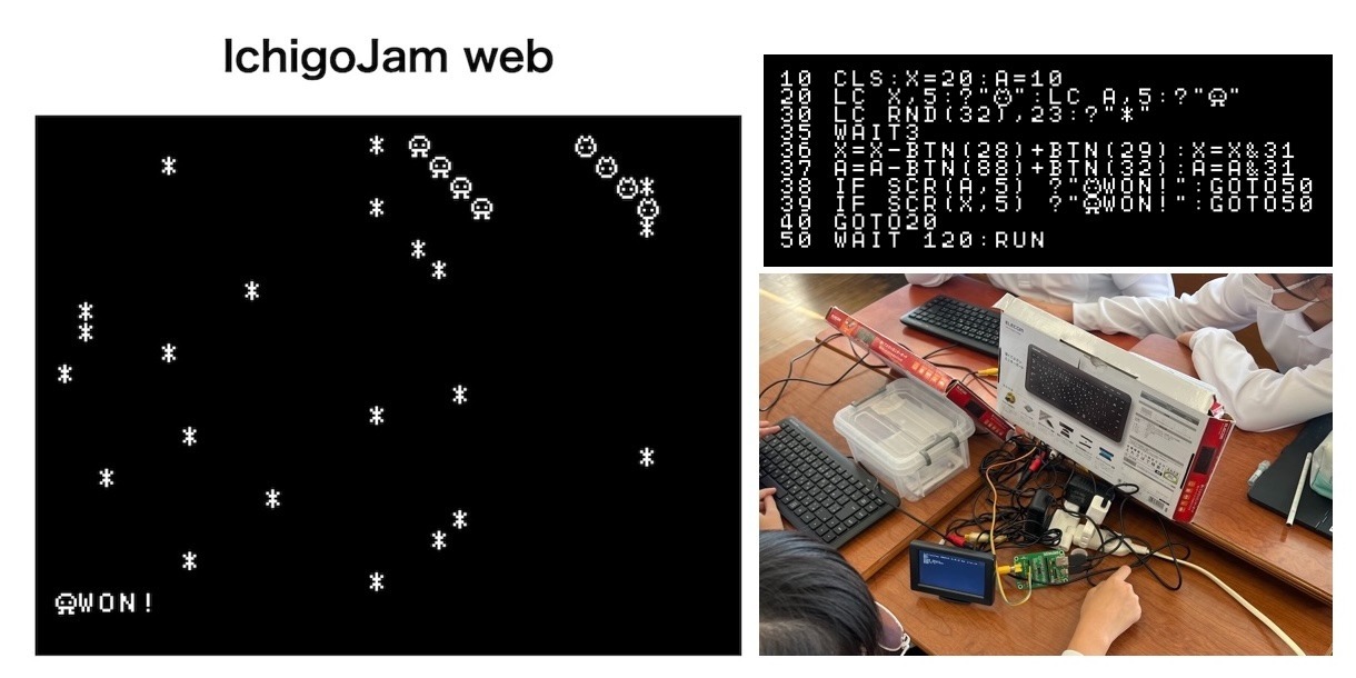 みんな大好き、通信対戦ゲームの仕組みに触れたので、かわくだりゲームの対戦版をプレゼント。今回やったようにジャンパー線を使って、OUTからINにつなぎ、IN()コマンドを使うと遠隔のIchigoJamを使った通信対戦ゲームにも改造できます。