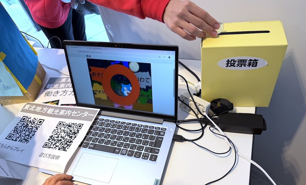 特産品をすばやく東北6県のどこかにドラッグし、観光者に回答するゲーム「東北地方観光案内センター」