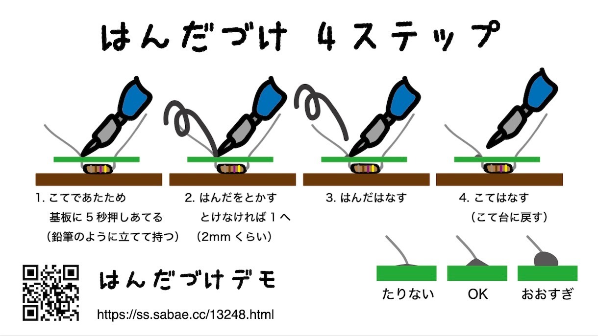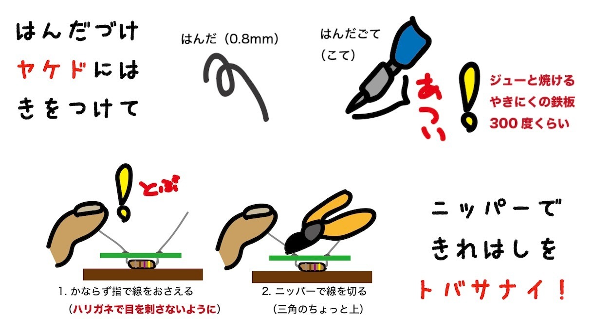 印刷用に作った参考資料。はんだづけ、ヤケドにきをつけて。ニッパーはきれはしをトバサナイ!