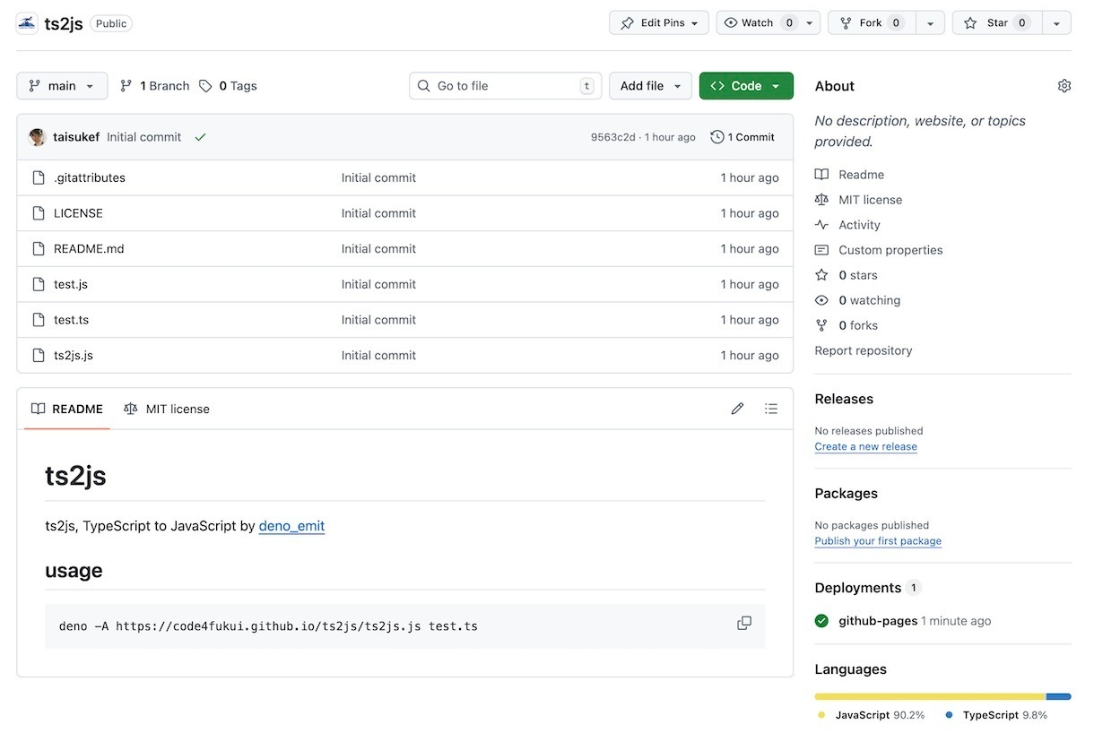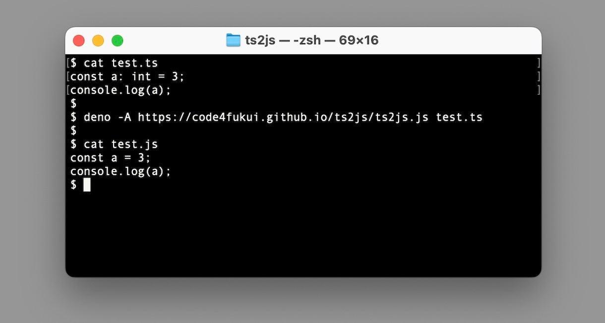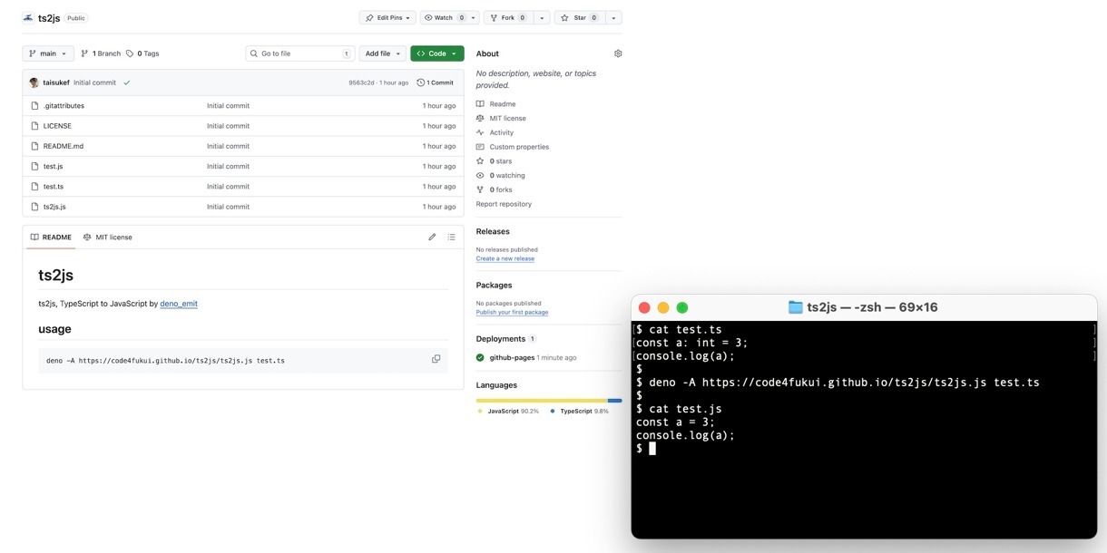 せっかくなので自動化すべくDeno内のプロジェクトのひとつdeno_emitを使ったコマンドラインツール ts2js ができました。